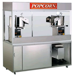 This twin 60 ounce popcorn cabinet can produce up to 2,400 one ounce servings of delicious popcorn per hour! Designed for up-front production, this dual popper with stainless steel cabinet is an excellent choice that is both extremely durable and easy to use and operate. Two built-in charcoal filter and exhaust fan systems efficiently remove oil and smoke during production. Internal cabinet heat lamps, stainless steel receiving tray with heating element, and recessed storage bin work together to keep freshly popped corn dry and crisp. Two 50# raw corn bin drawers are standard on this machine, but can be upgraded to 100# drawers for added storage. The top comes as a plain stainless steel top, or can be ordered with either Customer or Operator merchandising (with neon or back-lit fluorescent sign). No one can resist the sight and aroma of freshly popped corn! For dramatic up-front production, choose the Cretors President Popper. Cretors unique clean-in-place kettle design includes stainless steel, or nickel-plated all steel that resists corrosion, and is easy to clean.