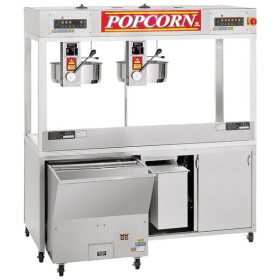 Double the popping capacity with a second twin kettle and two power cords to ensure no down time! The six foot cabinet provides extra corn storage for increased production during busy times. Cretors exclusive one-piece, automatic lid jump-up design along with the stainless steel kettle featuring a counter balance dump and return system makes popping and dumping corn easy. Other features include tempered safety glass, Vyvak doors, cycling pilot light, digital temperature controls, stainless-steel interior and a drop shelf. The Halogen lighting system illuminates the cabinet, providing bright merchandising. The popcorn is kept fresh and crisp by Cretors high-powered Cornditioner system, which maintains the popcorn at just the right temperature for serving up big profits. The six foot Stainless-steel base includes an oversized stainless-steel slide out 100 lb corn bin. Oil pump sold separately.