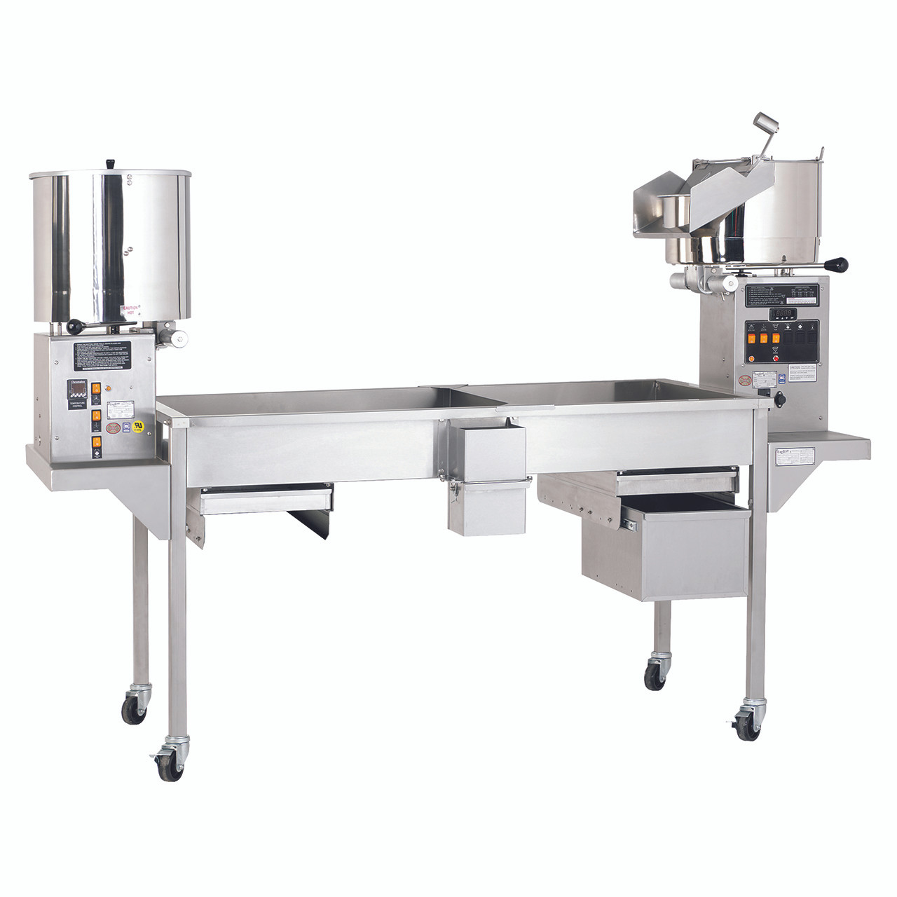 If high volume backroom production is what you need, install pedestal popper kettle(s), CMD25 or CMD50 caramelizers, Double Feature onto our Production Plant tables to create the popping plant you need. Match the kettle size with the perfect table for your operation. Expand your product line to include savory, as well as candy and caramel coated popcorn. Key features include rust proof stainless-steel construction, accepts both electric and gas poppers, 50lb corn chute. Shown with Giant Electric Popper and CMD50 NOT INCLUDED.