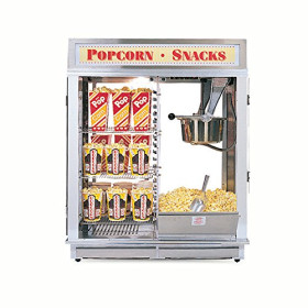 This combination Popcorn machine and warmer from Astro 16 is extremely user-friendly. "Bottom Line" oriented is what the Pop and Self-Serve Combo 16 oz. kettle popcorn machine really is. This machine uses the very successful Astro 16 kettle and it's 36" (91cm) wide cabinet is divided in half. The 3 adjustable shelfs have a total of 24" to work with. The reversible illuminated sign helps attract attention to this great self serve popcorn machine. A single self-closing door on the customer side allows people to serve themselves and be shielded completely from the hot kettle. The illuminated dome is reversible. This machine also has a bottom heater/blower unit to keep you popcorn warm.
