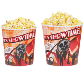 Draw in customers and attractively package your delicious popcorn with this Gold Medal 2134T 85 oz. leakproof popcorn bucket! Featuring an eye-catching movie reel graphic, this sturdy bucket is a great way to display and serve your popcorn while protecting patrons from buttery hands! Perfect for your concession stand or movie theater. Sold 300 per case.