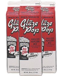 How is Glaze Pop made? Glaze Pop can be made in any popcorn machine, but having a Gold Medal popper with an EZ Kleen kettle will lessen the carbon build up and make the kettle easier to clean. When popping, it is important to add the oil and popcorn first, making sure the oil is completely melted before adding the Glaze Pop. This allows the product to melt in the oil and not get direct heat from the kettle. Add half the amount of Glaze Pop as you do popcorn. For example, in a 6 oz kettle you would add 3-4 ounces. As the kernals pop, the ones that pop first will have a heavier coating and the kernals will have less and less coating as popping begins to slow. Do not wait until the last kernal pops as with salt. Instead, as the popping slows, dump the kettle to avoid any axcess burning or smoke. Since the sugar on the kernals is still hot, it is important to screen the popcorn a little to cool it before serving or packaging.