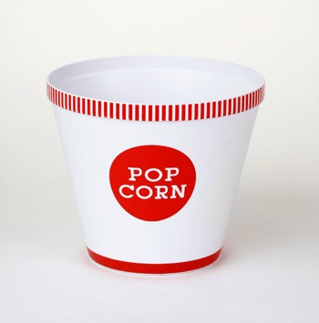 This festive red/white striped rimmed bucket is big enough to hold 6 quarts of popcorn! There is an insert in the bottom of the bucket keeping the un-popped kernels separate - from the delicious popcorn you are about to enjoy. You will be serving popcorn - just like at the movies. Large plastic bucket is 9" across the top of bucket and 8" tall.
